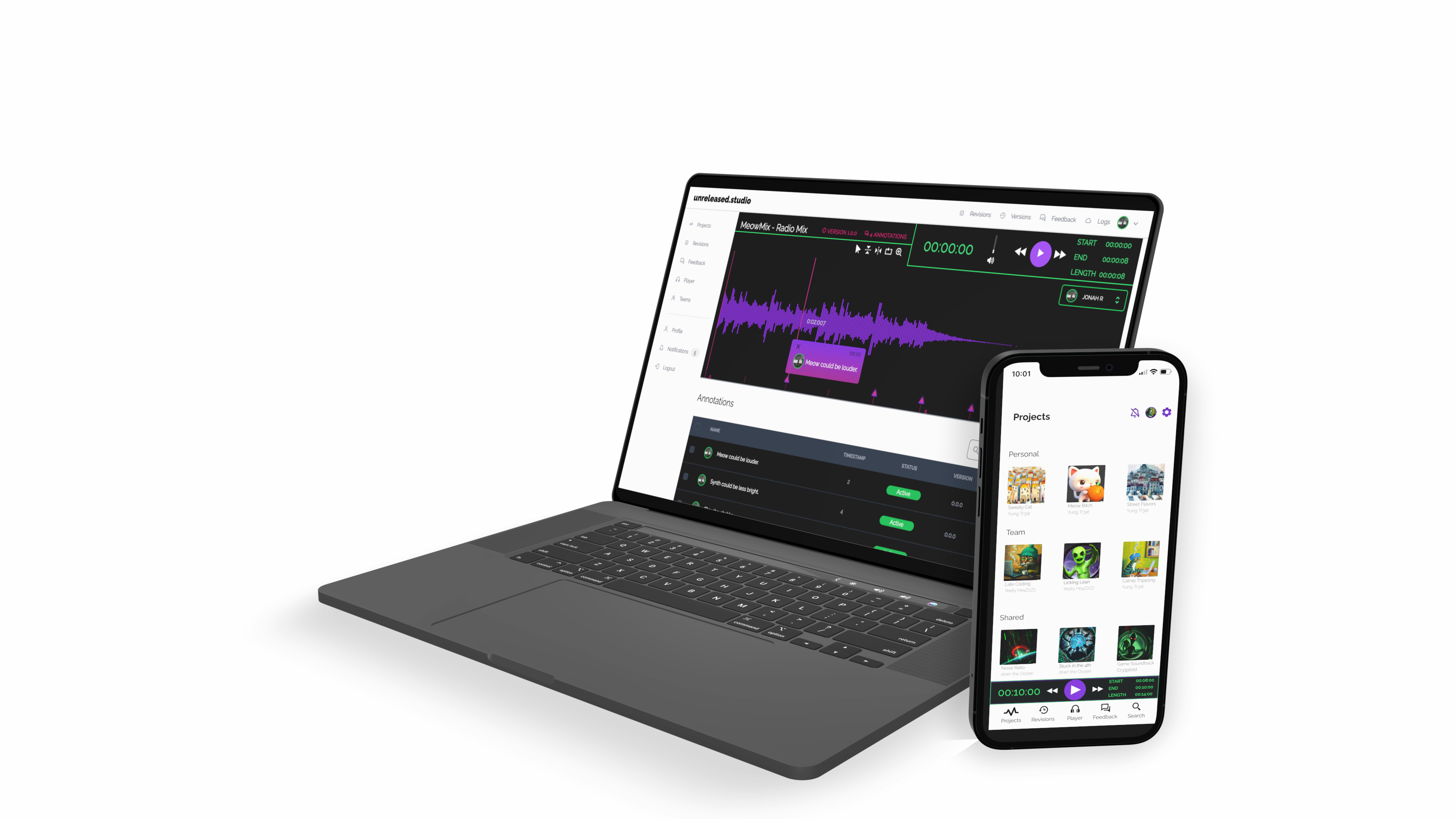 Allows musicians, producers, and other audio creative staff to version, annotate, track feedback, request changes and manage for any-sized projects, albums, single audio tracks, or videos.
